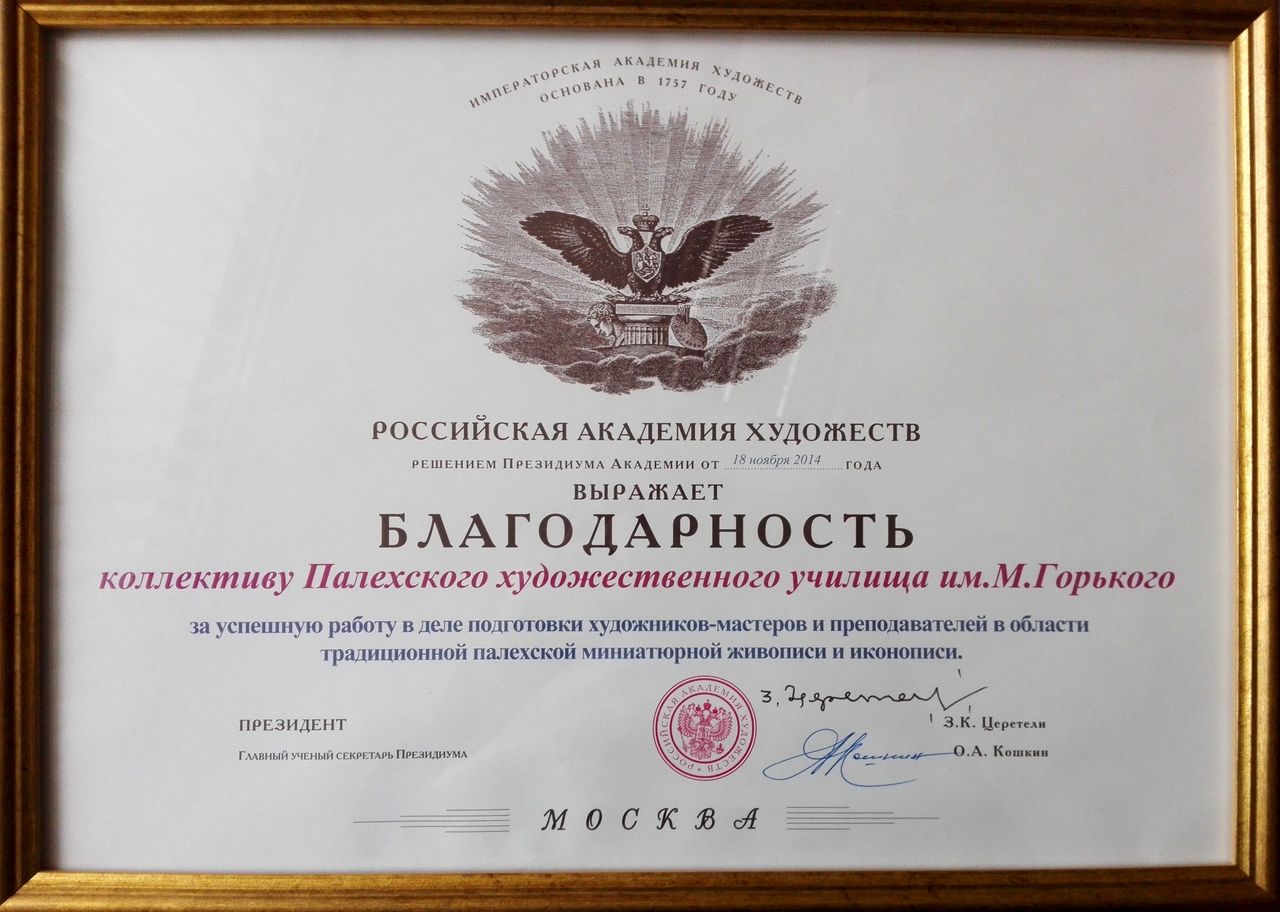 Благодарность коллективу училища от Российской академии художеств.